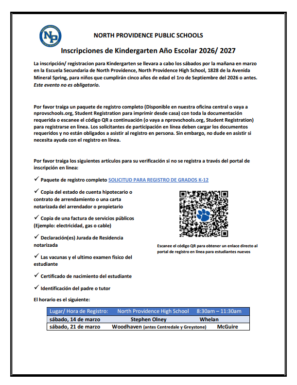 Kindergarten registration will be held on Saturday mornings in March at the North Providence High School for children who will be five years of age by September 1, 2026.